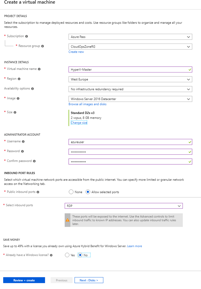 First, we have to deploy the Azure Virtual Machine. After Microsoft released Dv3 and Ev3 VM size, we are in position to deploy Virtual Machines on Azure to host Hyper-V virtual machines.